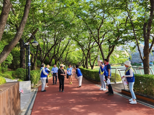 [광성일보] 송파구(구청장 서강석)는 제78주년 광복절을 맞아 많은 주민들이 태극기 달기에 동참할 수 있도록 관내 민간공익단체 주관으로 릴레이 캠페인을 진행한다고 밝혔다.캠페인에는 평소 지역사회에서 꾸준히 나눔과 봉사를 실천해 온 새마을운동, 바르게살기운동, 한국자유총연맹, 재향군인회가 참여한다. 릴레이 방식으로 9일과 15일에 단체별 홍보를 진행한다.첫 시작은 새마을운동송파구지회(회장 이승현)가 9일 오전 8시 잠실역에서 진행하였다. 회원 100여 명이 함께 하여 출근길 시민들에게 손태극기를 배부하며 나라사랑에 동참해 달라는 인사를 건넸다.