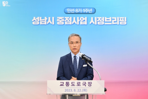 [광성일보] 성남시는 민선 8기 1년을 맞아 공약사업 및 중점사업의 추진 성과와 향후 계획을 시민 및 언론인과 공유하기 위해 교통도로국 주관으로 8월 22일 오전 11시 한누리에서 일곱 번째 시정 브리핑을 진행했다.진명래 교통도로국장은 “성남시를 교통 허브로 만들어 모든 시민이 안전하고 편리하게 대중교통과 교통기반시설을 이용할 수 있도록 최선을 다할 것”이라고 밝혔다.