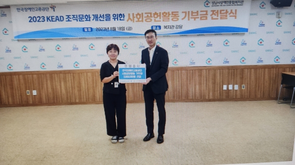 또한, 공단은 공동목표인 1,004만 걸음수를 달성하였을 경우 사회공헌활동으로 사회복지시설에 기부를 하는 프로그램을 동시에 진행하고, 이를 달성함으로써 성남시장애인종합복지관에 300만원을 기부하여 장애인 복지증진에 사용하였다. 공단 조향현 이사장은 “공단의 직장문화를 위해 처음 진행한 직원 걷기 챌린지가 많은 임직원들의 참여와 관심으로 잘 진행되고, 이와 더불어 ESG 경영실천, 사회공헌활동은 조직문화의 대외적인 효과로 연결된 것으로 의미가 있다”라고 말하며 “앞으로도 다양한 캠페인을 진행하여 친환경 조직 문화 조성과 사회공헌활동에 앞장 설 것”이라고 강조하였다.