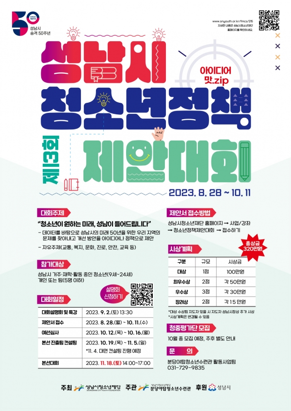 [광성일보] 성남시청소년재단 분당야탑청소년수련관(관장 정영숙)에서 제13회 성남시청소년정책제안대회 「아이디어 맛.zip」(이하 정책제안대회)를 개최한다고 밝혔다.올해 13회를 맞이한 정책제안대회는 성남시 승격 50주년을 맞이해 ‘청소년이 원하는 미래, 성남이 들어드립니다.’라는 슬로건을 가지고 다양한 데이터를 바탕으로 성남시의 미래 50년을 위해 지역의 문제를 찾아내고 개선 방안을 프로그램이나 정책으로 제안하는 대회다.