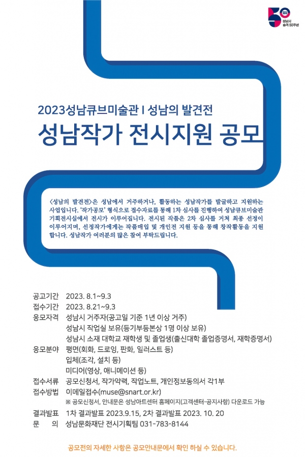 [광성일보] 성남문화재단(대표이사 서정림)이 성남시 시 승격 50주년을 기념해 성남의 우수작가를 발굴해 지원하는 ‘2023 성남의 발견전’ 작가 공모를 진행한다.‘2023 성남의 발견전’은 성남을 중심으로 활동하는 우수작가를 시민들에게 소개해 지역 예술가에 관한 관심을 높이고, 작가들에게는 창작환경을 향상해 지역의 건강한 미술문화 형성에 기여하기 위한 사업이다.