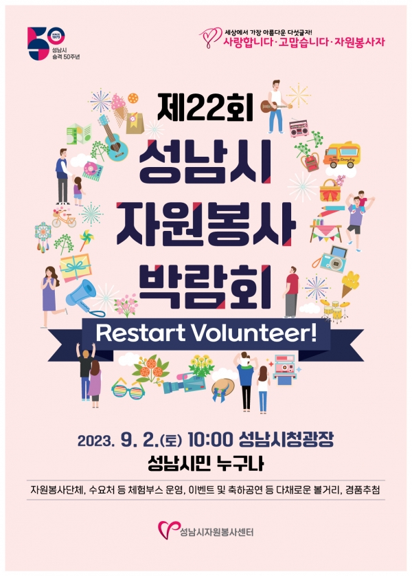 성남시(시장 신상진)자원봉사센터는 오는 9월 2일 오전10시부터 성남시청 앞 광장에서 ‘제22회 성남시자원봉사박람회’를 개최한다.