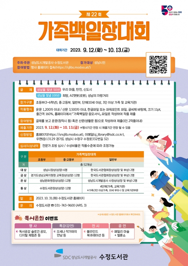[광성일보] 성남도시개발공사(이하 공사)가 운영하는 수정도서관은 제22회 가족백일장을 개최한다고 28일 밝혔다.시 승격 50주년을 기념해 개최되는 이번 가족백일장은 9월 12일부터 10월 13일까지 온라인으로 운영되며, 10세부터 성인까지 성남시민이면 누구나 참여할 수 있다.