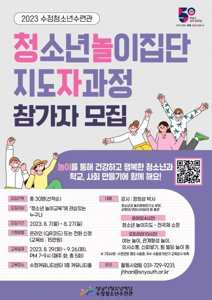 해당 과정은 수강생 30명을 대상으로 약 한 달간 화요일 오후 7시에 진행되며 수료 이후,다양한 놀이집단 프로그램 운영을 위한 온라인 교육으로 지속적인 역량을 강화해 나갈 예정이다.수정청소년수련관 서재민 관장은 “지역의 많은 분들이 청소년 놀이문화 확산에 대한 관심을 가지고 참여해 주셔서 감사하고 이번 교육으로 성장하는 기회가 되길 바란다” 며, “청소년 놀이 프로그램 확산을 통해 청소년이 창의적이고 행복하게 성장할 수 있도록 노력하겠다”고 전했다.