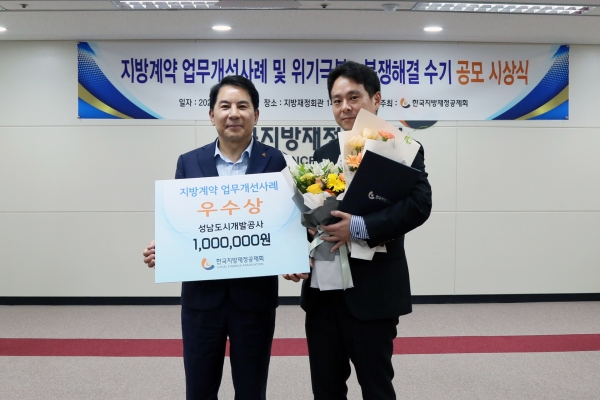 성남도시개발공사(이하 공사)는 지난 29일 한국지방재정공제회에서 주최하는 ‘지방계약 업무개선사례 및 분쟁해결 수기’ 공모전에서 우수상을 수상했다고 1일 밝혔다.지난해에 이어 2년 연속이다.