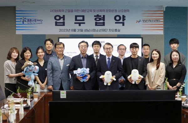성남시청소년재단(대표이사 최원기)과 푸른나무재단(이사장 박길성)은 31일, 청소년 사이버폭력 근절을 위한 예방교육 및 비폭력 문화운동 확산을 위해 업무협약을 체결했다.
