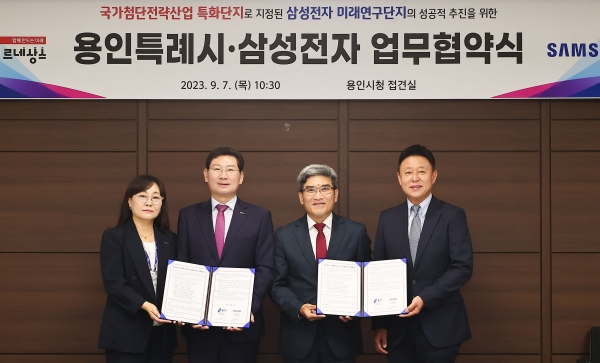 [광성일보] 용인특례시(시장 이상일)는 7일 삼성전자와 국가첨단전략산업 특화단지로 지정된 기흥캠퍼스(122만 5000㎡, 37만여 평) 내 ’미래연구단지(10만 9000㎡, 3만3000여 평)‘의 성공적 조성을 위한 업무협약을 체결했다.이날 협약식에는 이상일 용인특례시장, 송재혁 삼성전자 DS 부문 CTO(사장), 엄재훈 삼성전자 DS 부문 대외협력팀장(부사장) 등 관계자 10여 명이 참석했다.