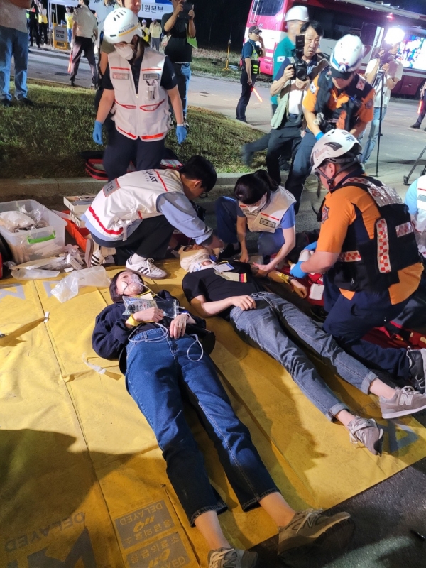 [광성일보] 성남시(시장 신상진)는 행정안전부, ㈜SR과 합동으로 9월 8일(금) 새벽 2시에 재단 대응 훈련인 ‘READY Korea’ 첫 번째 훈련의 일환으로 ‘고속철도 터널 화재 사고 대응 훈련’을 실시했다.이번 READY Korea 고속철도 터널 화재 사고 대응 훈련은 새로운 유형의 재난에 대비하고 재난 대응 태세 역량을 높이기 위해 SRT 고속철도 율현터널(중원구 여수동 소재) 5km 지점에서 방화로 인한 화재 발생을 가정하여 실시했다.지하 터널에서 지상까지 승객들을 신속히 구조하고 피해를 최소화하기 위한 ‘구조, 대피, 이송, 사상자 지원’ 과정으로 실전과 동일하게 진행했다.