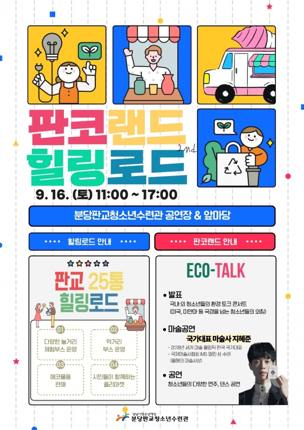 특히, 분당판교청소년수련관 앞마당에서 판교동 마을 축제‘판교25통 힐링로드 축제’가 함께 개최되어 더 풍성한 즐길 거리를 제공한다. 축제에는 지역의 공방과 연계하여 공방 문화예술 체험, 유기농, 비건푸드, 환경을 위한 노웨이스트 물품 판매, 플리마켓 등을 운영한다.행사 담당자(분당판교청소년수련관 양우미)는 “우리가 현재 살고 있는 환경은 미래를 살아갈 청소년을 위해 모두가 함께 노력해야 한다. 기후위기문제 인식변화를 위해 최선을 다하겠다”고 전했다.