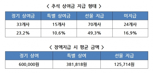 추석 상여금 지급여부는 응답기업의 118개사 83.1%가 지급할 계획인 것으로 조사되었으며, 이 중 33개사(23.2%)가 정기상여금, 15개사(10.6%)가 사업주 재량 특별상여 형태로 지급하고, 70개사(49.3%)는 상품권 또는 명절 선물 등을 제공한다고 답했다.상여금 지급 수준은 일정금액으로 지급하는 경우, 정기상여금은 평균 600,000원, 특별상여금은 평균 381,818원, 상품권 등 선물을 지급하는 경우 평균 125,714원 상당의 물품을 지급하는 것으로 조사되었다.본 설문에 참여한 기업의 50.0%(71개사)가 올 추석 체감경기는 ‘지난해보다 악화’로 가장 많은 응답을 했으며, 악화 사유로는 ‘내수침체(76.1%)를 가장 큰 이유로 꼽았다.
