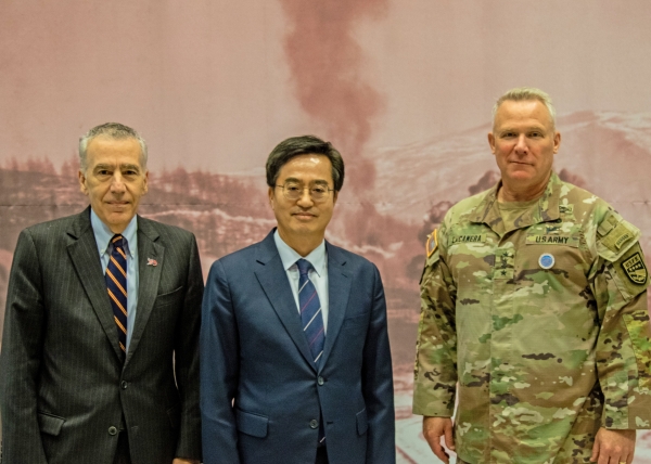 [광성일보] 김동연 경기도지사가 필립 골드버그(Philip S. Goldberg) 주한미국대사와 함께 경기도 평택 주한미군 캠프 험프리스에서 폴 러캐머라(Paul LaCamera) 주한미군사령관·한미연합군사령관·유엔군사령관, 윌러드 벌러슨(Willard M. Burleson III) 미8군사령관, 라이언 키니(Ryan P. Keeney) 미7공군부사령관 등 주한미군 핵심 장성들을 만나 경기도와 주한미군 협력 방안을 논의했다.김동연 지사는 13일 캠프 험프리스에서 폴 러캐머라 주한미군사령관·한미연합군사령관·유엔군사령관과 윌러드 벌러슨 미8군 사령관을 만나 “한미동맹의 상징인 캠프 험프리스에 초청해 주셔서 감사하다. 미군의 안정적 정착을 돕고 미군의 임무 수행을 경기도가 적극 지원하겠다”라고 말했다.폴 러캐머라 사령관은 주한미군이 전투태세를 유지하는 동안 이어진 경기도의 지원에 감사를 표하며, 여러 정부기관 등과 관계를 지속적으로 강화하고 있다며 70주년 한미동맹의 굳건함을 강조했다.