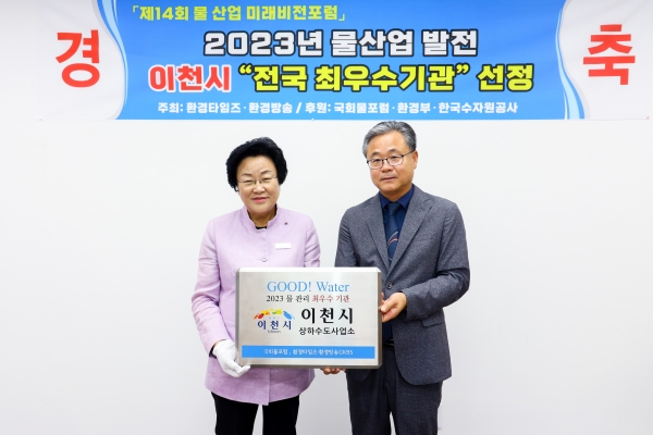 [광성일보] 환경타임즈·환경방송GKBS에서 주최하고 국회물포럼·환경부에서 후원하는 제14회 물 산업 미래비전 포럼 ‘2023년 물 산업 발전을 위한 상생협력 최우수기관“으로 이천시(시장 김경희)가 선정되어, 지난 13일 부산항국제컨벤션센터에서 개최되는 행사에 초청되어 시상식에 참석하였다.이천시와 함께 전국 지자체중 천안시, 함양군도 수상의 영예를 안았다.올해 최우수 기관으로 선정된 이천시는, 증가하는 물 수요에 대응하기 위해 「2040 이천시 중·장기 계획을 반영한 수도정비기본계획」을 환경부로부터 최종 승인(2022.09)을 득하여, 이를 바탕으로 수도시설 현대화 사업, 친환경·에너지 절감 사업, 정수시설 확충 및 개선사업 추진 및 수도사업의 효율적인 운영을 위한 국·도비 확보 노력이 우수한 것으로 평가되었다.