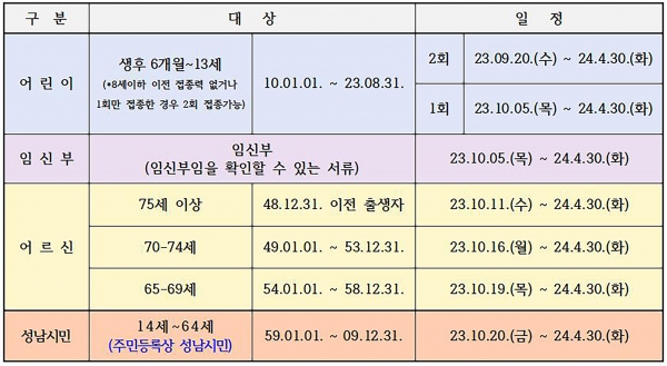 성남시는 오는 9월 20일부터 내년 4월 30일까지 92만여 명의 모든 시민에게 인플루엔자(독감) 백신 무료 접종을 시행한다.