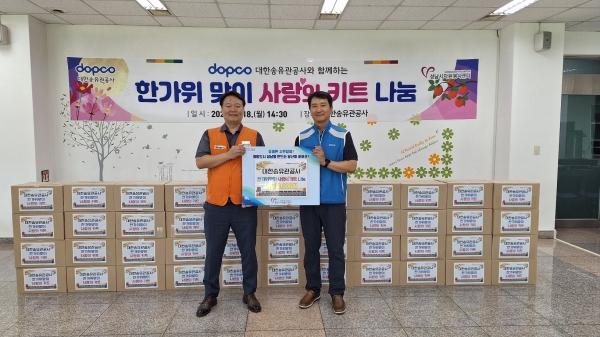 성남시 대한송유관공사 본사에서 열린 <한가위 맞이 사랑의 키트 나눔> 전달식에는 대한송유관공사 이동훈 경영관리본부장, 성남시자원봉사센터 한호상 자원연계부장, 그리고 선물키트 포장 봉사에 참여했던 공사 임직원들이 자리를 함께 했다.공사 관계자는 ”코로나19로 잠정 중단했던 지역 내 독거노인 및 차상위 계층 어린이를 대상으로 도시락 배달, 나들이 지원 등 다양한 봉사활동을 이번 전달을 계기로 재개하면서, 2019년부터 전국 12개 거점 지역 소방서와 연계한 소방관련 사회공헌 활동도 꾸준하게 펼칠 것“이라고 밝혔다.