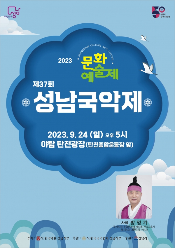 [광성일보] (사)한국국악협회 성남시지부(지부장 이향우)가 주관하고, 성남예총(회장 송위혁) 주최, 성남시가 후원하는 ‘제37회 성남국악제’가 9. 24(일)오후5시, 야탑 탄천 광장(탄천종합운동장 앞)특설무대에서 열린다.2023 성남문화예술제 행사의 일환으로 열리는 이번 성남 국악제는, 국가 지정 무형문화재 제19호 전승 교육사이며, 경기민요 대통령상 수상자인 방영기 명창의 해설과 사회로, 경기민요예술단, 민요 앙상블 나나니, 8인 8색, 고마니 아낙네예술단, 가야금 앙상블 ‘청’ 등 다채로운 국악 프로그램으로 신명 나는 국악한마당으로 열린다.