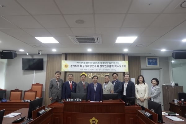 방성환 의원(국민의힘, 성남5)은 “치유농업 관련 연구는 많지만 실질적으로 사업을 진행할 수 있는 프로그램이 부족하다”며, “경기도 농업·농촌 특성을 반영한 치유농업 프로그램을 개발하여 경기도민의 삶의 질 향상에 기여할 수 있도록 실효성 있는 연구 결과가 나오길 바란다”고 전했다.한편, 농정해양연구회는 경기도 농정해양위원회 위원으로 구성된 연구단체로써, 시장도매인제 도입 필요성 및 활성화 방안, 농업용 저수지 효율적 활용방안 등 경기도 농업 발전을 위한 다양한 정책·현안 분석을 진행한 바 있다.