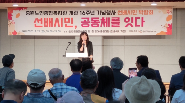 중원노인종합복지관 신명희 관장은 개관 16주년을 맞이하여 의미있는 개관 행사를 위해 선배시민 박람회를 진행했다고 했다. 신명희 관장은 ”노인이 돌봄의 대상을 넘어 지역사회에서 공동체를 함께 만들고 이끌어 나가는 주체로서 선배시민의 의미를 더 많은 사람에게 알리기 위한 박람회라며 그동안 어르신들이 지역사회에서 선배시민으로 활동했던 환경 캠페인 등 참여부스를 만들어 지역사회가 함께 참여하는 장이 되었다“며 궂은 날씨에도 불구하고 많은 분들이 참여해 주신것에 대해 감사의 마음을 전했다. 이 날 진행된 선배시민 박람회는 친환경적 박람회로, 선배시민 동아리 참여자들이 중심된 박람회가 열렸다. 박람회에서는 우리 생활에 밀접한 환경분야부터, 지역사회의 역사보존과 지역의 현안문제, 상담 등 다양한 분야외에 재미요소까지 함께하여 이를 직접 참여해 볼수 있는 17개의 체험부스를 운영하여 지역주민들과 함께 소통하는 문화의 장을 마련하였다.