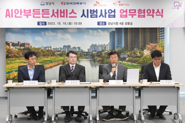 [광성일보] 성남시는 인공지능(AI), 통신 빅데이터 관련 기관·기업과 손잡고 사회적 고립가구의 안부를 24시간 확인하는 서비스를 추진한다고 10일 밝혔다.시는 이날 오전 10시 시청 4층 상황실에서 신상진 성남시장과 신운섭 한국전력공사 성남지사장, 최낙훈 SK텔레콤 부사장, 이준호 재단법인 행복커넥트 이사장 등이 참석한 가운데 ‘AI 안부 든든 서비스 시범 도입에 관한 업무협약’을 했다.