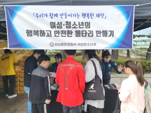 [광성일보] 성남중원경찰서 여성청소년과에서 프로축구 K리그2 성남FC와 충남아산FC전 주말 홍보부스 운영과 함께 학교폭력·학대등 관련 아동을 초청해 경기 관람을 지원하였다.성남중원경찰서 여청과 캐치프레이즈「여성·청소년의 행복하고 안전한 울타리 만들기」홍보 부스는 가정폭력·아동학대·스토킹·학교폭력등 홍보물품, 리플릿 교부등과 함께 민원 상담을 지원하였다.