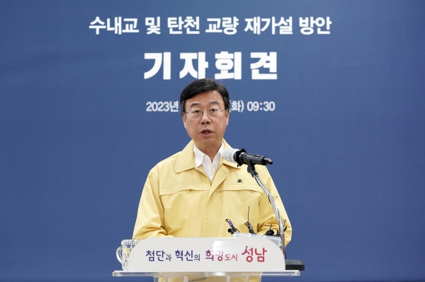 [광성일보] 신상진 성남시장은 10일 “전면 개축하는 수내교를 비롯해 기존 보도부 철거 후 재가설하는 탄천 교량의 차로 폭을 현행 그대로 유지하거나 최소 3.2m 이상 확보될 수 있도록 추진하겠다”고 밝혔다.신 시장은 이날 오전 성남시청 한누리에서 기자회견을 통해 ‘수내교와 탄천교량 재가설 방안’을 소개하며 이같이 말했다.성남시가 이번에 수내교를 비롯한 정비 대상인 탄천 교량은 도시지역 시속 60km 이하의 속도제한을 적용받는 구간으로 차로 폭 3.0m 이상을 확보하면 도로 관련 규정을 충족한다.