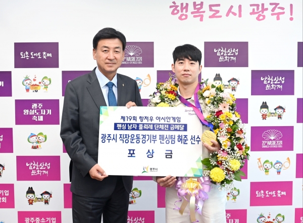 광주시는 11일 시장실에서 ‘제19회 항저우 아시안게임’에 펜싱 국가대표 일원으로 참가해 금메달을 획득한 광주시청 직장운동경기부 펜싱팀 허준 선수의 환영식을 개최했다.