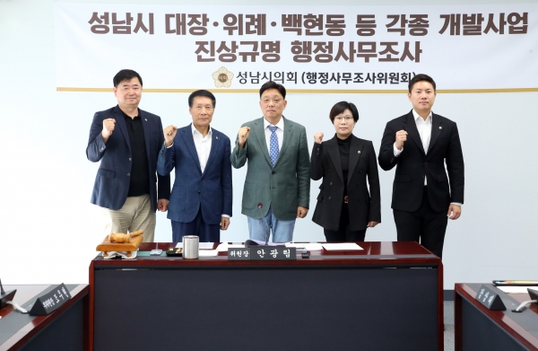 성남시 대장 위례 백현동 등 각종 개발사업 진상규명 행정사무조사」가 마무리된 가운데, 행정사무조사위원회 안광림 위원장은 “이번 행정사무조사에서 지적된 사항들을 면밀히 재검토하여 신뢰받는 성남시로 바로 설 수 있도록 반드시 제도개선이 필요하고, 특히 민간사업자 개발이익을 위한 특혜소지 분야에 대하여는 끝까지 추적 조사하여 다시는 성남시민의 이익에 반하는 사태가 발생하지 않도록 위해 노력하겠다.”고 밝혔다.11일 원안 가결된 행정사무조사 결과보고서는 오는 287회 임시회 안건으로 상정되어 처리되어 집행부에 통보될 예정이다.