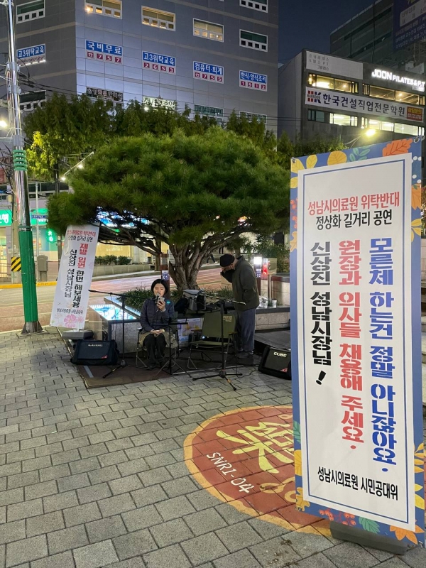 청년 방모씨는 스물다섯스물하나 노래를 하며 “성남시의료원의 운영에 있어서 또 다른 문제는 의료 인력의 문제이고, 우리나라 전체를 봤을 때, 비인기과는 붕괴 직전이라 그러니 말할 것도 없고, 인기과에서조차 종합병원에 들어가기보다 개인 의원을 차리고자 하는 의사들이 많고 공공의료에 질 좋은 의료 인력을 끌어들이기 위한 노력들, 제도들이 아직 많이 부족하다”면서 “성남시의료원이 원장과 의사들을 모셔오는데 최선을 다해 달라”고 당부했다.이윽고 지나가는 다양한 성남시민들이 길거리 공연을 지켜봤다. 시민들의 길거리 공연 실력에 놀라움에 박수를 치기도 하고 응원 쪽지를 건네기도 했다.