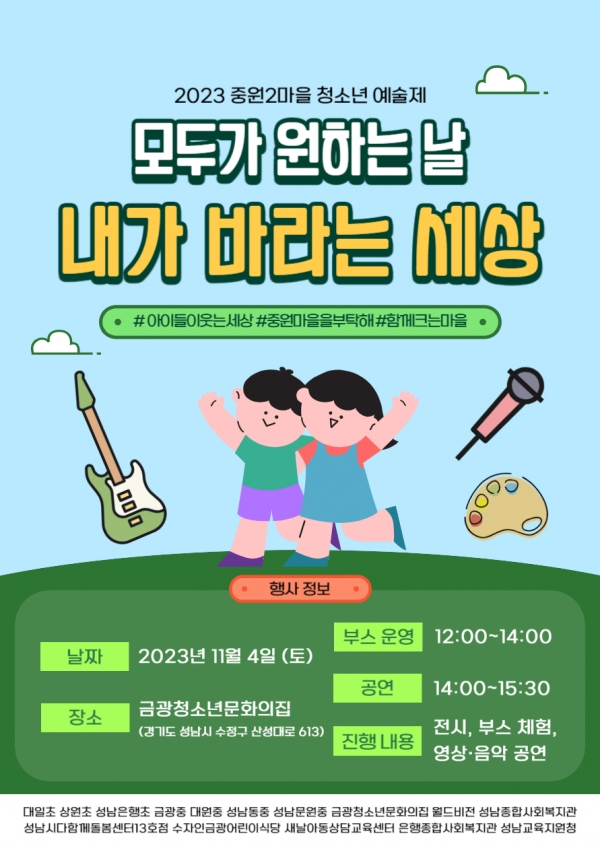 [광성일보] 성남시 함께크는마을 중원2마을에서는 다가오는  금광청소년문화의집(성남시 수정구 양지동 소재) 4층 그레이스홀(12:00~15:30)에서 청소년예술제 ‘모두가 원하는날, 내가 바라는 세상’을 개최한다.