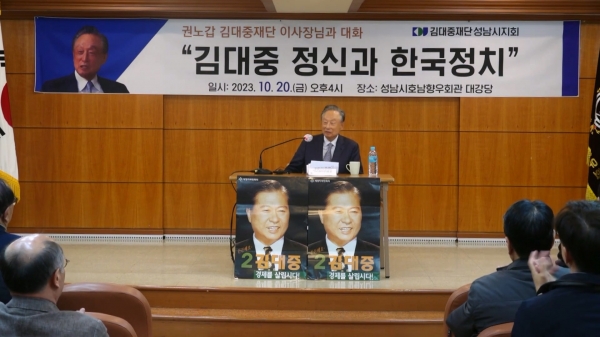 [광성일보] 김대중 전 대통령의 복심 권노갑 김대중재단 이사장이 7월에 이어 성남을 다시 찾아 현 정치인에 대한 쓴소리를 거침없이 쏟아내며, 김대중 정신으로 민주주의를 발전시켜야 한다고 강조하고 나섰다.김대중재단 성남시지회(지회장 백왕순)는 20일 호남향우회 대강당에서 ‘권노갑 김대중재단 이사장과의 대화’의 시간을 마련, 권 이사장이 직접 ‘김대중 정신과 한국 정치’를 주제로 강연을 펼쳤다.