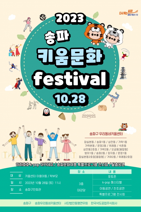 [광성일보] 송파구(구청장 서강석)가 결실의 계절 가을을 맞아 10월 28일 송파구민회관에서 관내 18개 키움센터가 주최하는 장기자랑 발표회 ‘송파키움문화 페스티벌’을 선보인다.송파키움센터는 관내 초등학생(만6세~12세)이라면 누구나 이용할 수 있는 방과 후 돌봄서비스를 제공하는 기관이다. 유소년인구가 많은 송파구는 서울 25개 자치구 중 세 번째로 많은 18개의 센터가 있으며 약 400여명의 아동이 이용하고 있다.‘송파키움문화 페스티벌’은 센터 이용아동 장기자랑 발표회로, 코로나로 2년만에 열리는 행사인 만큼 1년간의 활동 결과를 공연과 전시로 구분하여 풍성하게 구성하였다.먼저, 구민회관 대강당에서 열리는 공연발표회에서는 ▲K팝 댄스·뮤지컬 ▲송파산대놀이 ▲난타 ▲단체합창 등 신나는 춤과 노래로 무대를 꾸민다.
