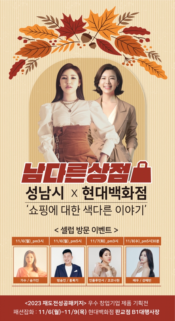 또한 셀럽초청 이벤트가 예정되어 있다.가수 송가인, 개그맨 홍록기, 배우 강예빈, 인플루언서 코코나현 등의 셀럽들이 기간 중 행사장을 방문해 성남시 중소기업을 응원할 계획이다.한편, 성남시-현대백화점 협력 ‘남다른상점’은 2019년을 첫 시작으로 지난 5년동안 성남시 중소벤처기업을 위한 판로확대와 지역사회를 위한 공헌활동을 꾸준히 지속해 왔다.