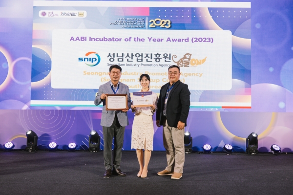 [광성일보] 성남시와 성남산업진흥원이 운영하는 성남창업센터(정글ON)는 10월 30일부터 11일 1일, 3일간 태국 방콕에서 열린 2023 아시아창업보육협회(Asian Association of Business Incubation) 총회 및 스타트업 컨퍼런스에 초청받아, 지난 10월 31일 본 행사 일환인 시상식에서 ‘올해의 창업보육센터상’을 수여 받았다.