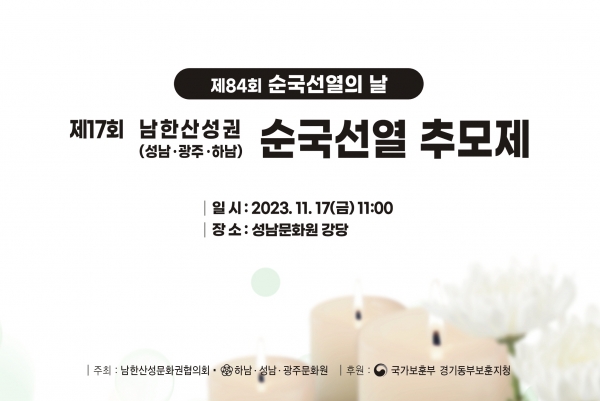 남한산성권 순국선열추모제는, 조국 광복을 위해 일본 제국주의 침탈에 맞서 싸우시다 희생되신 성남 · 광주 · 하남시 순국선열들의 숭고한 독립정신과 희생정신을 기리며, 해마다 3개 문화원이 행사장소를 바꿔가며 주최하는 행사로 올해는 성남문화원에서 열린다. 김대진 성남문화원장은 “나라를 위해 자주독립의 횃불을 높이 들고 항일전을 벌이다 희생되신 순국선열의 애국정신을 이어받아 민주 평화통일의 정신적 기초를 다져 나가야겠다.’고 밝혔다.