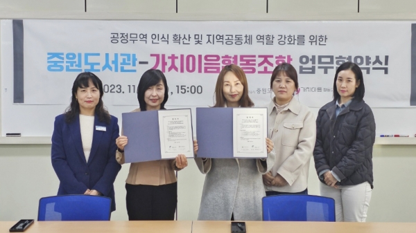 [광성일보] 성남도시개발공사(사장 박민우, 이하 공사) 산하 중원도서관은 공정무역 인식 확산 및 지역공동체 활성화를 위해 가치이음협동조합과 업무협약을 체결했다고 13일 밝혔다.가치이음협동조합은 교육과 캠페인을 통해 공정무역과 지속가능한 소비문화를 알리는 단체다.