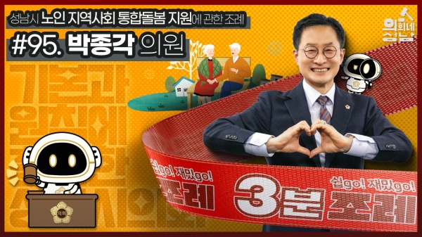 [광성일보] 성남시의회는 ‘3분 조례-박종각 의원 편’ 영상을 시의회 공식 SNS에 게시했다.이번에 소개된 조례는 박종각 의원 등 17명이 발의한 ‘성남시 노인 지역사회 통합돌봄 지원에 관한 조례’이다. ‘