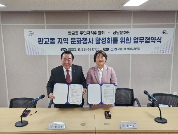 [광성일보] 성남문화원(원장 김대진)과 판교동 주민자치위원회(위원장 노경란)는 11월 22일 판교동 행정복지센터 회의실에서 ‘지역 문화행사 추진 시 상호 협력을 위한 업무협약(MOU)’을 체결했다. 협약에는 판교동 지역 문화행사(새해 천제봉행, 판교마당바위 해맞이 행사, 판교쌍용거줄다리기 등) 추진 시 상호 협력을 통해 지역주민의 문화 활동 참여 기회 확대 등의 내용이 담겼다.