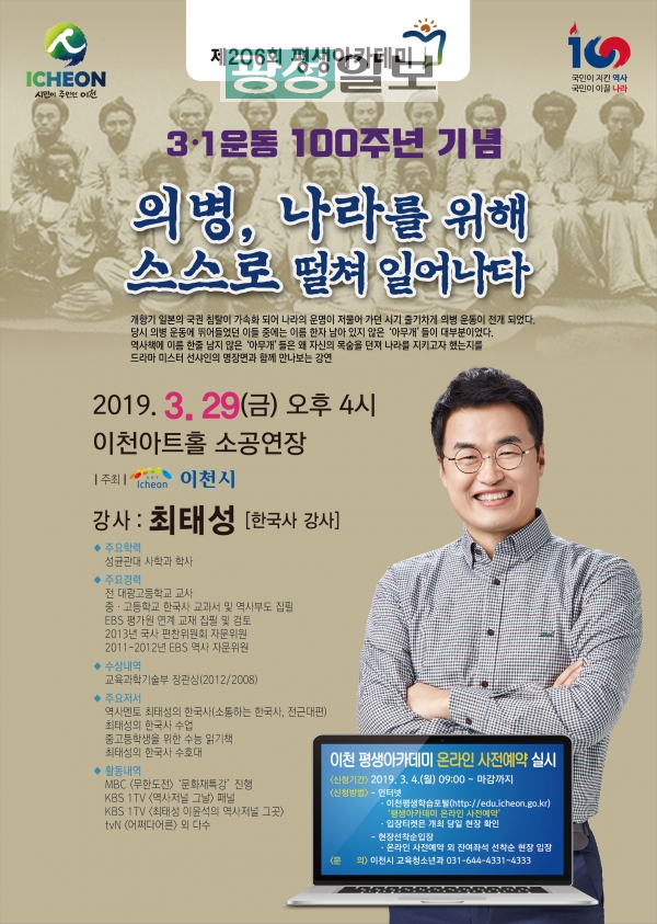 이천시(시장 엄태준)는 29일 오후 4시 이천아트홀 소공연장에서 역사분야 스타강사인 최태성 강사를 초청해 3·1운동 100주년을 기념하여 제206회 평생아카데미 강연을 연다고 밝혔다.