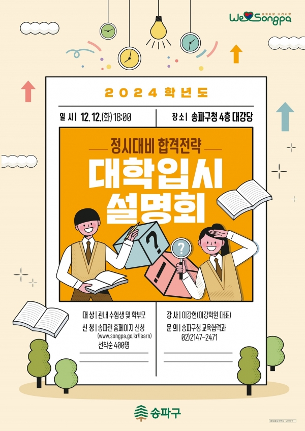 [광성일보] 송파구(구청장 서강석)가 대학수학능력시험을 치른 관내 수험생과 학부모의 고민과 불안감을 덜고, 성공적인 정시 합격전략을 지원하기 위해 ‘2024학년도 정시대비 대학입시설명회’와 ‘1:1진학컨설팅’을 진행한다고 밝혔다.먼저, 12월 12일 18시 송파구청 대강당에서 ‘2024학년도 정시대비 대학입시설명회’를 개최한다.