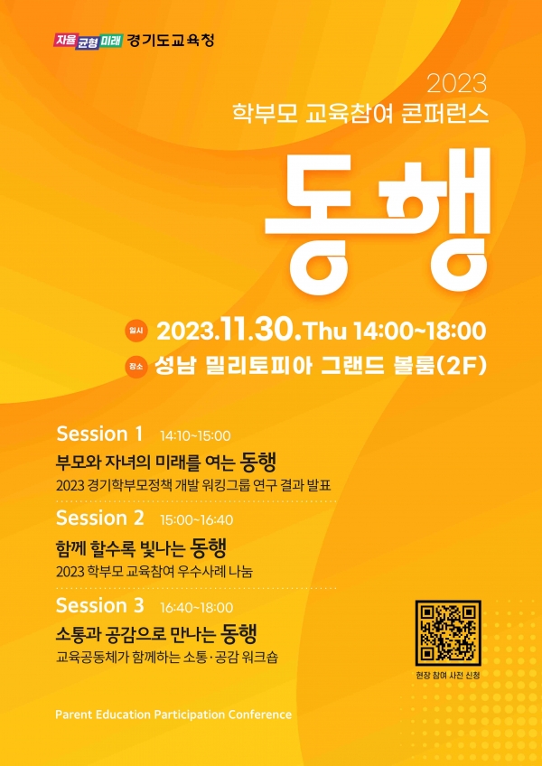 도교육청 정은지 협력지원과장은 “이번 콘퍼런스가 가정과 학교의 협력적 소통과 건강한 문화를 조성하는 뜻깊은 자리가 될 것”이라며 “학생의 행복한 삶을 지원하는 가정-학교 간 따뜻한 동행을 위해 학부모 교육참여를 적극 지원하겠다”고 말했다.한편 도교육청은 이번 콘퍼런스 현장 영상, 경기학부모정책 개발 워킹그룹 연구 결과, 학부모 교육참여 우수사례를 도교육청과 경기학부모참여지원센터 누리집에 탑재할 계획이다.