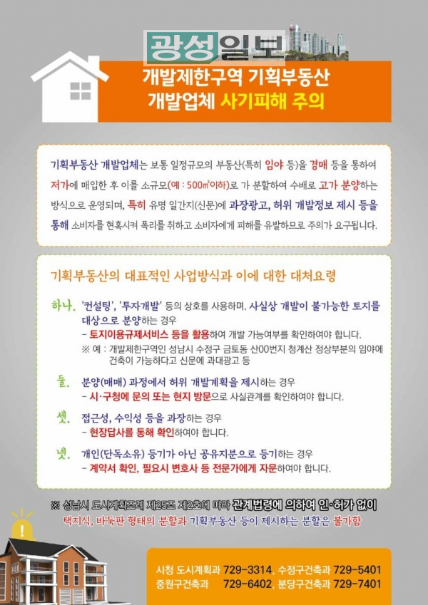 이에 시 관계부서로 전국에서 수십명의 문의전화가 와 상담을 통해 주의를 당부했다.이와 관련해 성남시는 기획부동산의 피해를 예방하고자 전단을 제작해 구청 및 동 주민자치센터 등에 배부해 홍보함으로써 주민들이 피해를 입지 않도록 하고 있다.