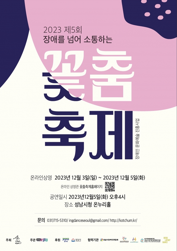 [광성일보] 성남시는 ‘제5회 장애를 넘어 소통하는 꽃춤축제’가 오는 12월 5일 오후 4시~6시 시청 온누리 무대에서 열린다고 1일 밝혔다.국제 장애인의 날(12.3)의 날을 맞아 장애 예술인 발굴과 관련 문화예술진흥에 이바지하려고 춤 아이엔지(옛 ING즉흥그룹)가 주최하고, 아이엔지콜라보그룹(온라인공연플랫폼 전문기업)이 주관하며, 성남시, 경기도가 후원해 열리는 행사다.