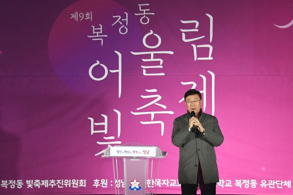 신 시장은 이날 격려사에서 “2012년부터 시작된 복정동 어울림 빛 축제는 주민이 자발적으로 추진위를 구성하고, 행사 전 과정에 참여해 만들어 가는 복정동의 소중한 자산”이라면서 “내년 1월 15일까지 44일 동안 성남의 관문에서 다양한 빛의 향연을 펼치는 이번 축제가 성남시민 모두에게 화합의 불빛으로 승화되길 기대한다”고 말했다.이날 개회식에는 신상진 시장을 비롯하여 김다위 선한목자교회 담임목사와 국회의원, 경기도의원, 성남시의원, 유관기관 관계자와 지역주민 등 300여 명이 참석했다.