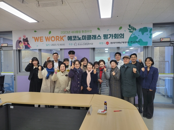판교노인종합복지관에서 2023년 세대통합 환경수업 ‘WE WORK’ 에코노미클래스 평가회의를 진행했다.