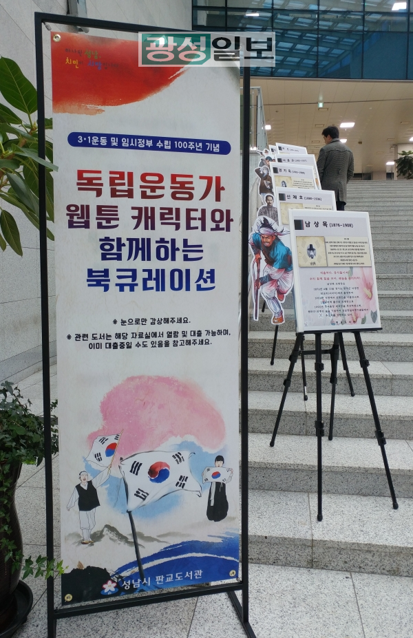 성남시 평생학습원 판교도서관은 3월 21일부터 4월 11일까지 독립운동가 웹툰 캐릭터전과 함께하는 북큐레이션 전시를 진행한다. 3월 28일부터 4월 4일까지 일주일간은 웹툰 캐릭터로 새롭게 탄생한 33인의 독립운동가 등신대 캐릭터를 함께 만나 볼 수 있다.
