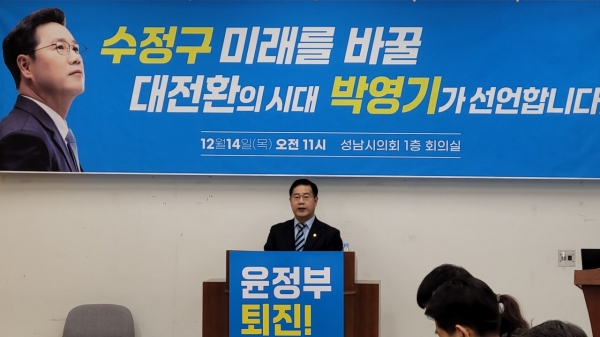 [광성일보] 22대 국회의원 선거 성남시 수정구 더불어민주당 박영기 예비후보가 14일 11시에 성남시의회 회의실에서“수정구 미래를 바꿀 대전환의 시대 박영기가 선언합니다”라는 제목으로 출마를 선언하였다.박영기 예비후보는 성남시민과 당원동지들을 대상으로 발표한 선언문에서 현재의 정치 상황과 성남시 수정구의 발전을 위한 대전환의 필요성을 강조하였다.박영기 예비후보는 선언문에서 대한민국의 현재를 "절망의 시대"로 묘사하며, 경제적 어려움과 사회 양극화, 출생율 저하 등의 문제에 대한 우려를 표명하였다. 특히, 윤석열 정권과 현 정치 검찰 집권에 대해 비판하며, 정치적인 양극화와 국민의 역량 모으기에 실패한 상황을 지적하였다. 이러한 상황에서 대전환의 필요성을 강조하고, 새로운 시대와 희망을 만들어야 한다고 주장하였다.