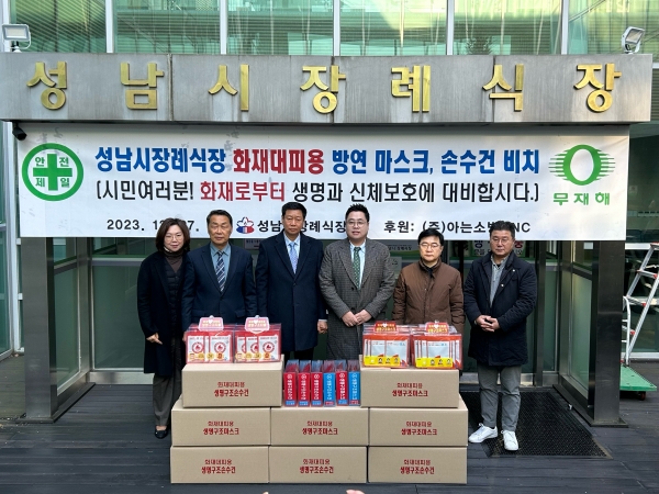 [광성일보] 성남시는 중원구 갈현동에 있는 장례식장에 화재 대피용 방연마스크, 손수건 등 소방 안전용품을 비치했다고 27일 밝혔다.소방설비 점검회사인 ㈜아는소방CNC(대표 김명신)가 이날 오전 10시 해당 물품을 성남시 장례식장에 기탁한 데 따른 조치다.