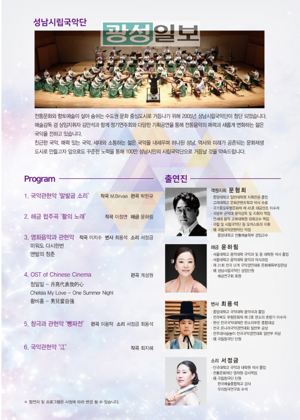 친근한 국악, 매력 있는 국악, 세대와 소통하는 젊은 국악을 내세우며 하나된 성남, 역사와 미래가 공존되는 문화재생 도시로 만들고자 앞으로도 꾸준한 노력을 통해 100만 성남시민의 시립국악단으로 거듭날 것을 약속드립니다.