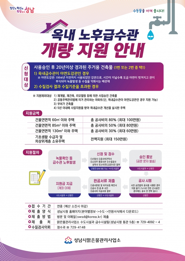 대상자는 신청서(성남시 홈페이지→분야별정보→수도→민원서식), 공사 견적서, 수질검사 성적서 또는 아연도강관 촬영 사진 등을 성남시청 5층 수도시설과에 직접 내거나 담당부서 이메일(swsd@korea.kr)로 보내면 된다. 이성진 성남시 맑은물관리사업소장은 “성남시는 지난해 모두 115가구에 9200만원의 옥내 노후 급수관 개량비를 지원했다”면서 “매년 공사비 지원을 통해 시민들이 맑고 깨끗한 수돗물을 공급받는 환경을 만들고 있다”고 말했다.