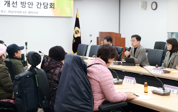 이날 간담회에서 중원장애인자립생활센터 이경원 소장은 “성남시가 장애인 콜택시를 80대 운영하지만, 아침 9시에 배차 신청하면 오후 1시쯤이나 배차가 된다.”라며, 시각장애인이나 발달 장애인 등 보행이 가능한 장애인은 바우처 택시를 이용할 수 있는 제도를 만들어 달라고 부탁했다.또한 분당장애인자립생활센터 조명필 소장은 “기본 배차시간이 2시간은 기본이고 승무원들이 불친절한 경우가 종종 있다.”라며 “승무원의 교육을 부탁하면서 성남시에서 직접 운영해 주길 바란다.”라고 전했다.이외에도 중증장애인 안전띠 미착용 운행, 승무원들의 반말 등 인격모독 수준까지 느낄 정도로 마음의 상처가 많다고 전해주었다.이날 참석한 성남시청 대중교통과 봉동열 팀장은 “장애인분들에게 개선 방안을 위해 승무원 교육에 더욱더 힘쓰겠다.”며 “차 번호 또는 승무원 이름을 알려주시면 징계까지 할 수 있도록 하겠다.”라고 대안을 내놓았다.