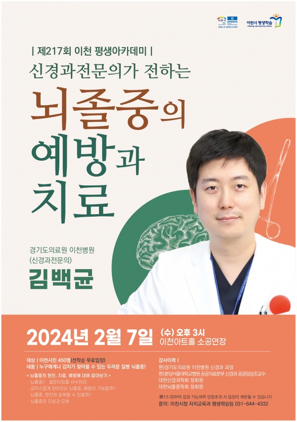 [광성일보] 이천시(시장 김경희)는 다음달 7일 이천아트홀 소공연장에서 김백균(경기도의료원 이천병원 신경과 과장)을 초청해 ‘뇌졸중의 예방과 치료’를 주제로 「제217회 이천 평생아카데미」를 개최한다.이번 강연은 경기도의료원 이천병원(원장 이문형)에서 지역주민을 대상으로 하는 건강강좌를 열어 주민들로부터 큰 호응을 얻은 것으로부터 비롯했다.